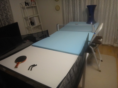 ダイニングテーブルは嫁のお気に入りですし(自分的には卓球台にしか見えない)、それ以外の機材は国際規格の卓球台を設置できた場合にも流用できます。